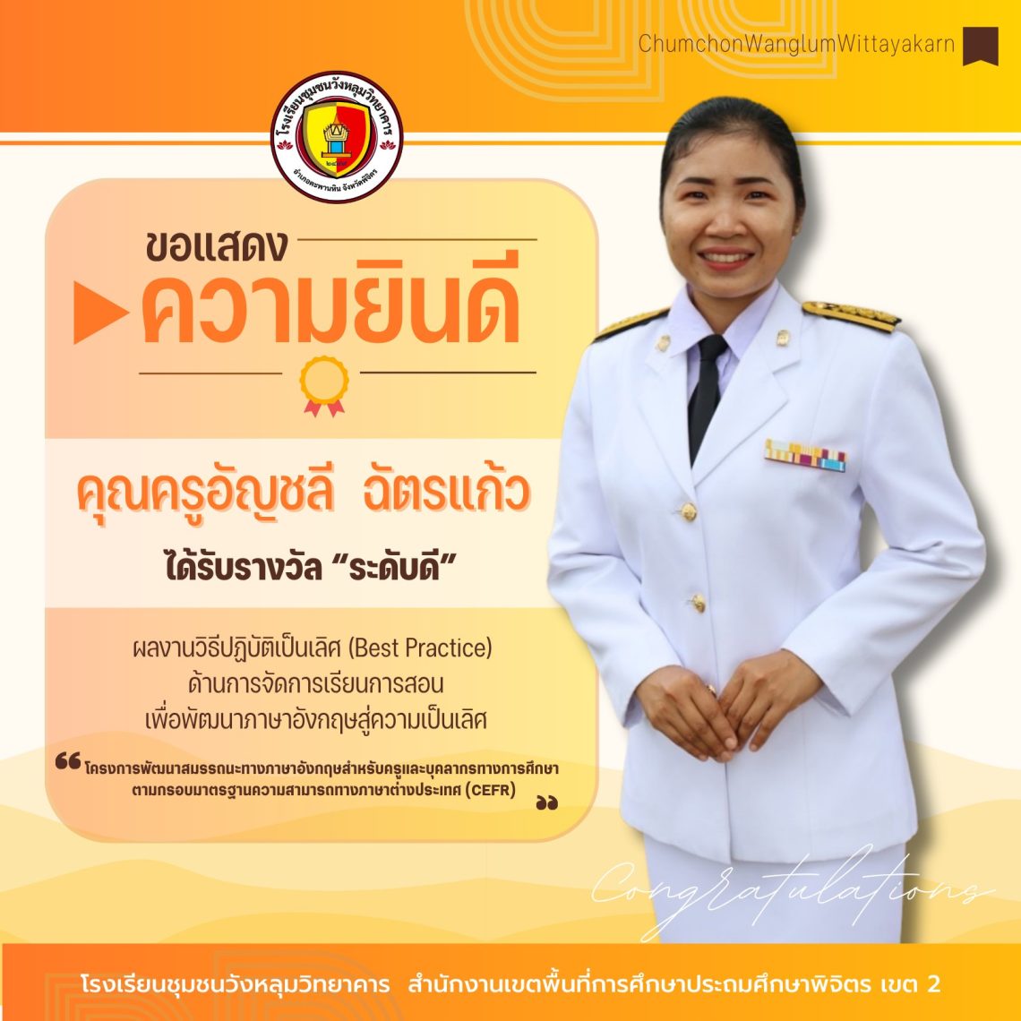 คุณครูอัญชลี ฉัตรแก้ว ที่ได้รับรางวัลวิธีปฏิบัติที่เป็นเลิศ (Best Practice) ด้านการจัดการเรียนการสอนเพื่อพัฒนาภาษาอังกฤษสู่ความเป็นเลิศ
